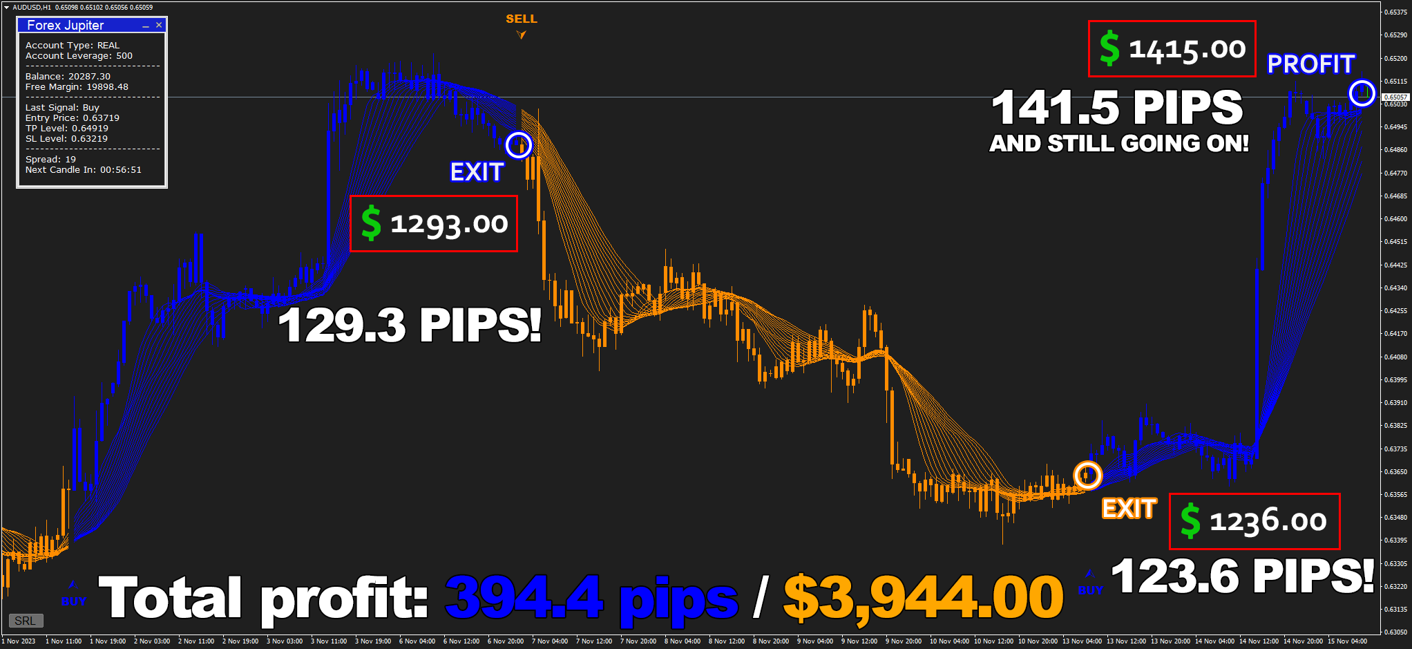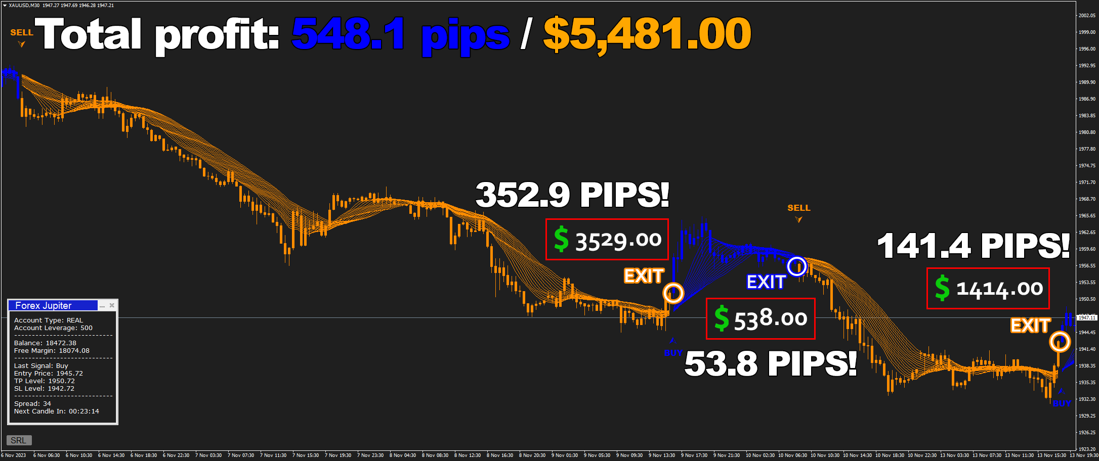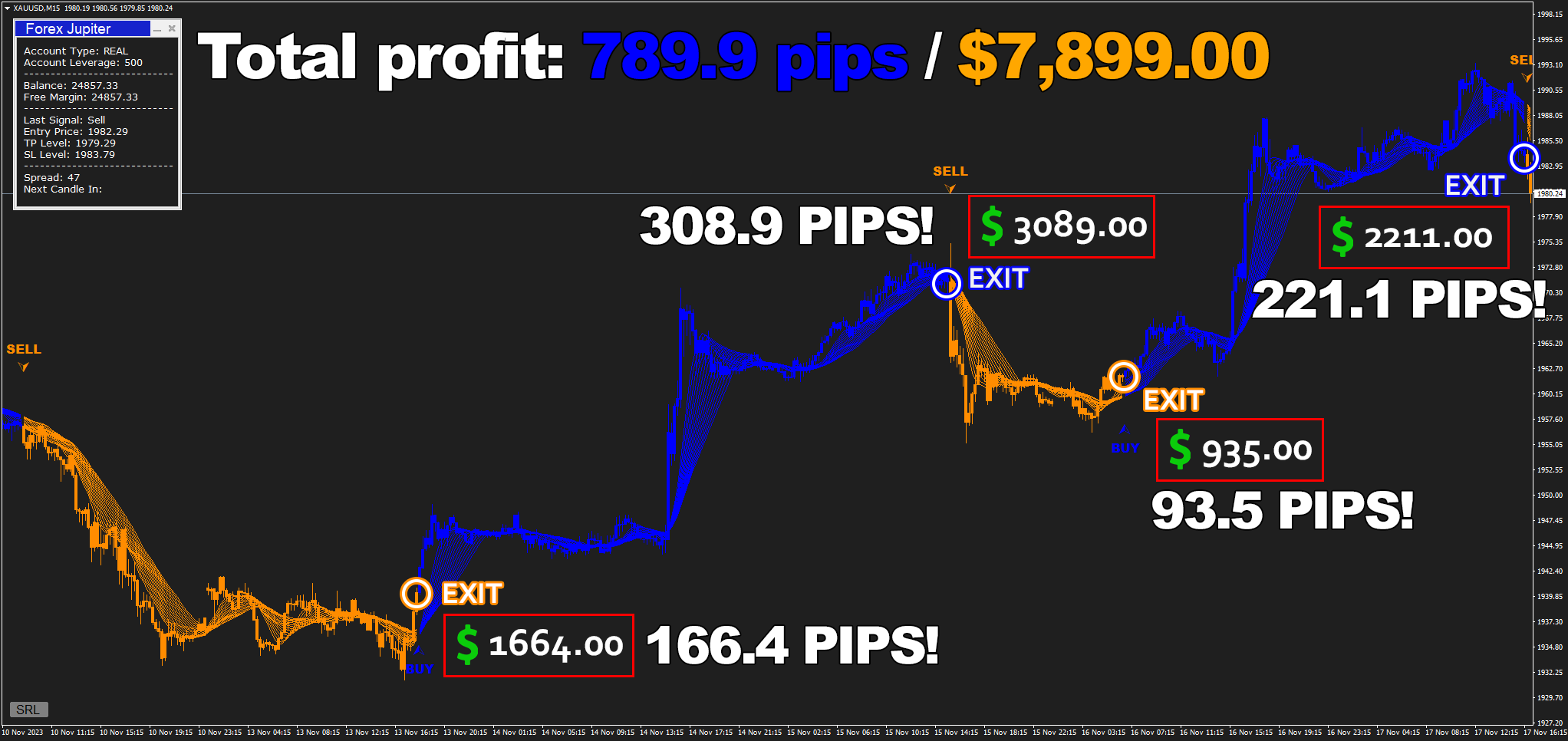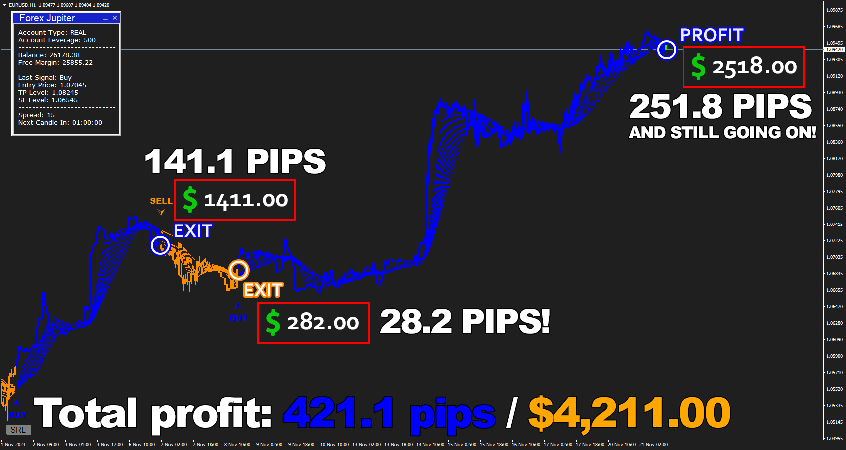 Forex Jupiter is incredibly beginner-friendly: It generates clear signals for you to follow, that come with highly accurate exit points and help you earn money - like $4,691.23 on M15 timeframe!